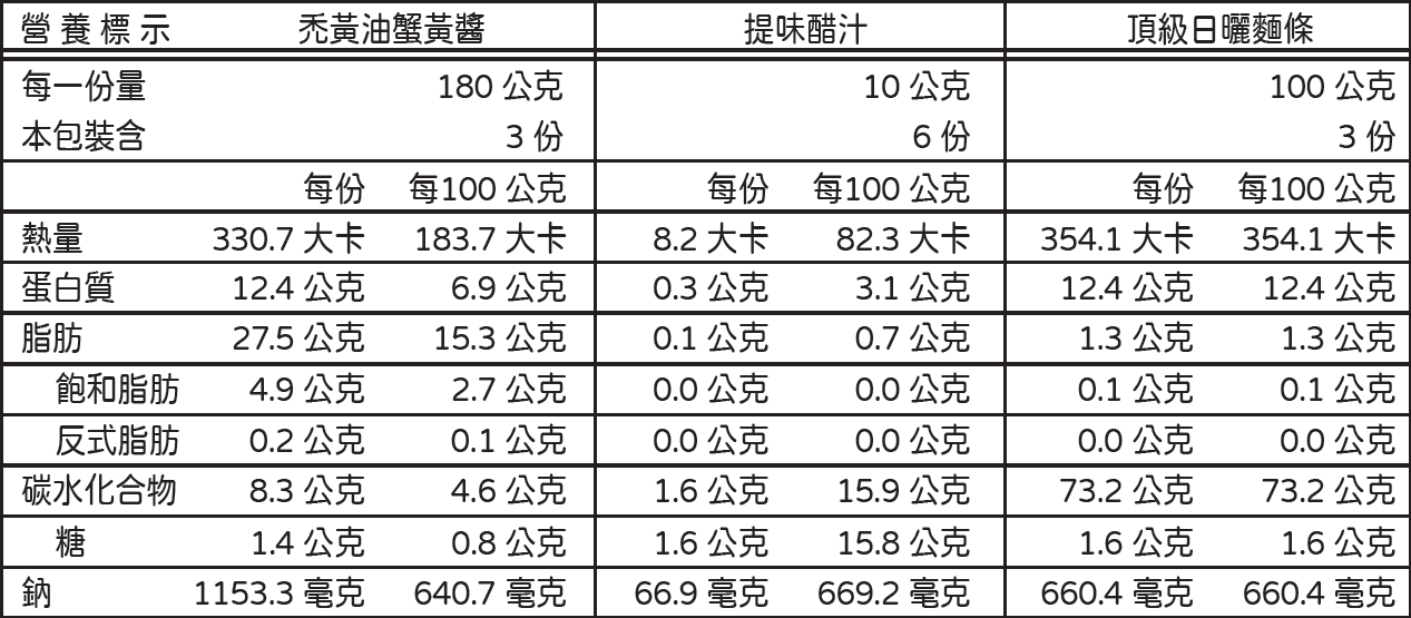 40%〔大閘蟹蟹黃(ERIOCHEIR SINENSIS)、大閘蟹蟹膏(ERIOCHEIR SINENSIS)〕、蟹油10%〔大豆油、生薑、胡蘿蔔、小蔥、大閘蟹 (ERIOCHEIR SINENSIS)、黃酒、食用鹽〕}、胡蘿蔔、複合調味料 〔水、味精、白砂糖、呈味核苷酸二鈉(5'-次黃嘌呤核苷磷酸二鈉 (IMP)、5'-鳥嘌呤核苷磷酸二鈉(GMP))、L-丙胺酸、焦磷酸二氫二鈉〕、蟹油〔(大豆油、生薑、胡蘿蔔、小蔥、大閘蟹(ERIOCHEIR SINENSIS)]、蔥油(大豆油、大蔥、生薑)、膨化豆製品(大豆拉絲蛋白)(大豆分離蛋白、低溫食用豆粕、穀朊粉、小麥粉、大豆濃縮蛋白)、羥丙基二澱粉磷酸酯、生薑、黃酒(水、大米、小麥、焦糖色素)、酵母抽出物、蠔油(水,蠔汁(蠔、水,食用鹽)、釀造醬油(水、 大豆、食用鹽、小麥)、白砂糖、玉米澱粉、食用鹽、小麥粉、酵母抽出物)、食用鹽、玉米油、B-胡蘿蔔素、維生素E、天然食用香料