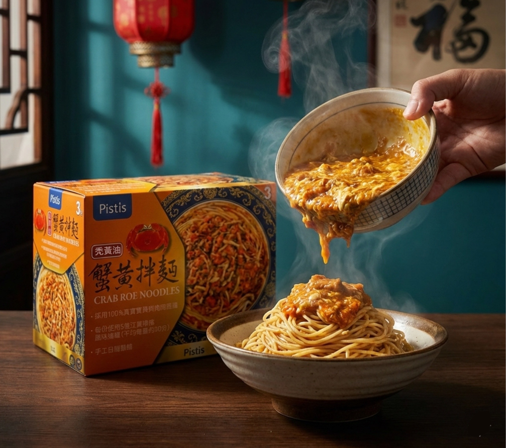 蟹黃拌麵的魅力在於「濃郁卻不膩」。視覺上蟹黃的橘金色具有強烈的食慾感,加上熱麵的蒸氣與油亮質地,自然而然成為社群上最容易爆紅的料理影像。而食品技術的進步,也讓這份原本需要蒸蟹、取黃、慢炒的繁複工序,變成家裡三分鐘就能完成的日常美味。它的走紅不是偶然,而是味道、便利性與文化記憶共同構成的必然。