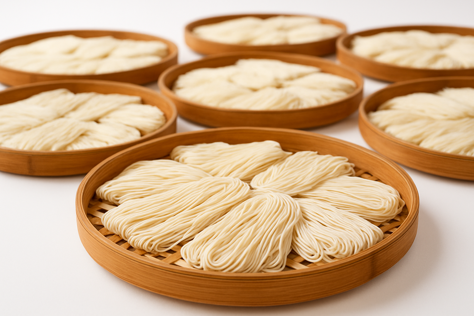 - 將麵條搭在竹竿上,麵條必須平均分布,避免過度集中導致乾燥不均