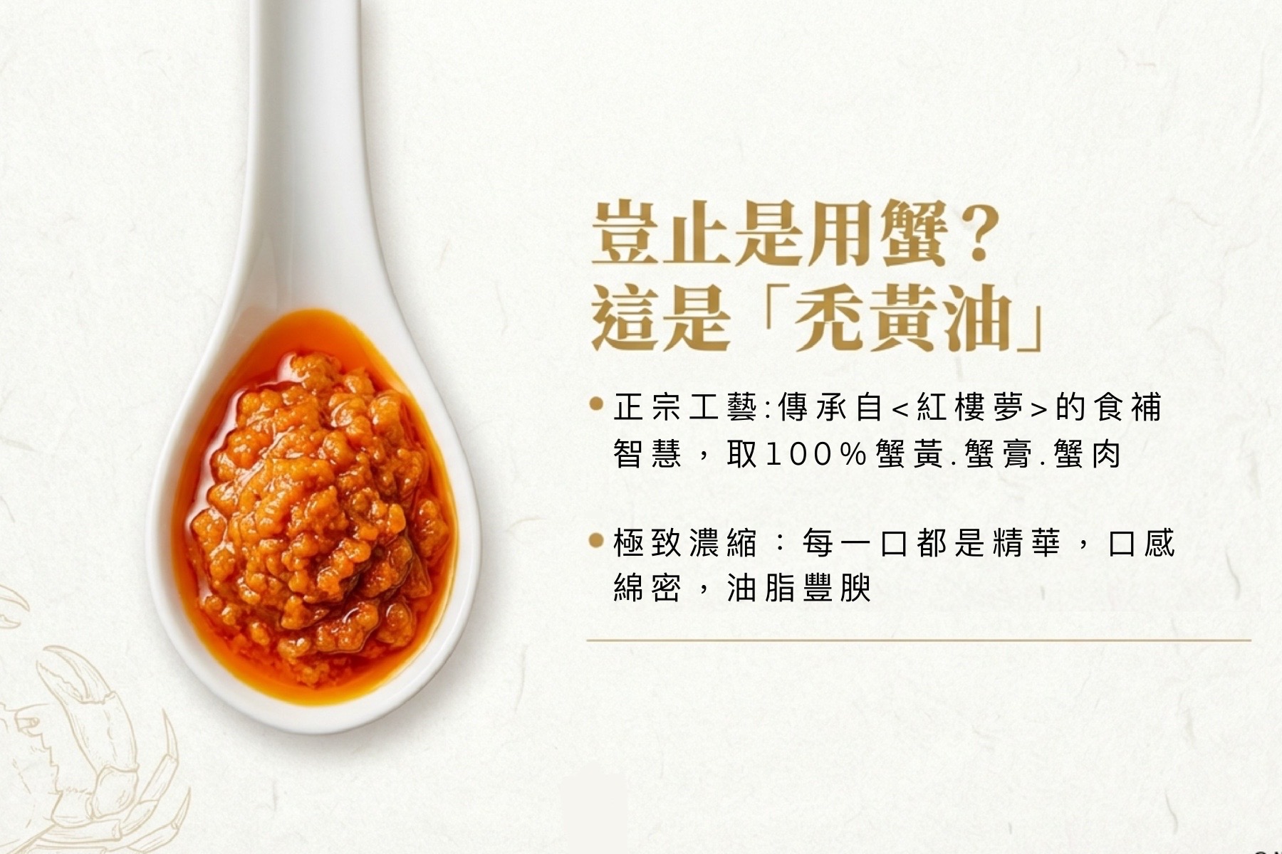 - 蟹黃=螃蟹裡最濃、最香、最肥美的部位