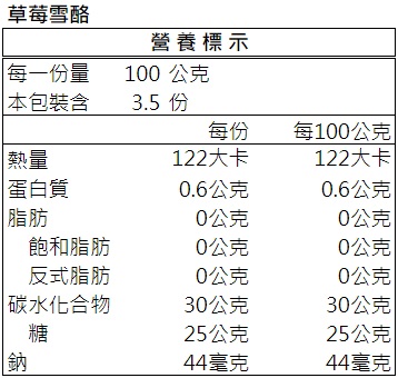 成分:草莓、水、砂糖、葡萄糖、覆盆莓、果寡醣、豌豆蛋白、鹽、天然香料、檸檬酸、刺槐豆膠、果膠(柑橘來源)